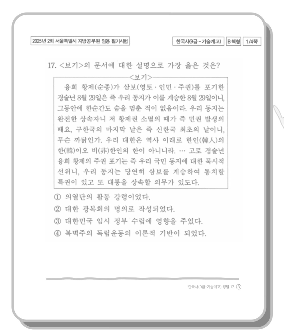 ④ 복벽주의 독립운동의 이론적 기반이 되었다. (X): 복벽주의는 고종을 다시 황제로 추대하려는 사상입니다. 이 문서는 반대로 황제권의 소멸과 민권(공화주의)의 발생을 강조하고 있습니다.