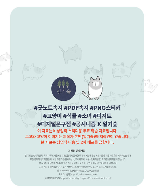 - PNG 이미지/스티커: 공부 기록(카공, 인강 등)을 더욱 풍성하게 만들어줄 귀여운 수호고양이 캐릭터 스티커입니다.